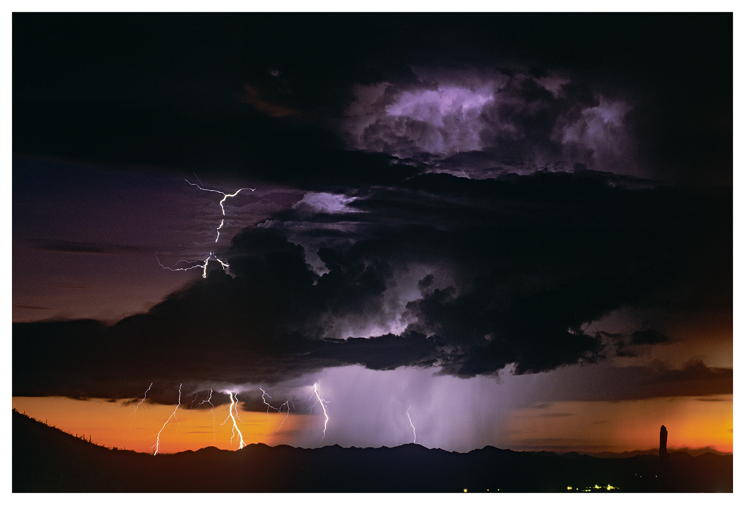 A very strong Severe thunderstorm moves over Thimble Peak and Blackett’s Ridge above the Sabino Canyon Area. The lightning bolts light up the green grassy hills and you can see Thimble Peak in the background. Shot on a Nikon F-100 with Fuji Velvia Film. The most severe lightning storm we have seen or photographed in 10 years in Tucson Arizona.