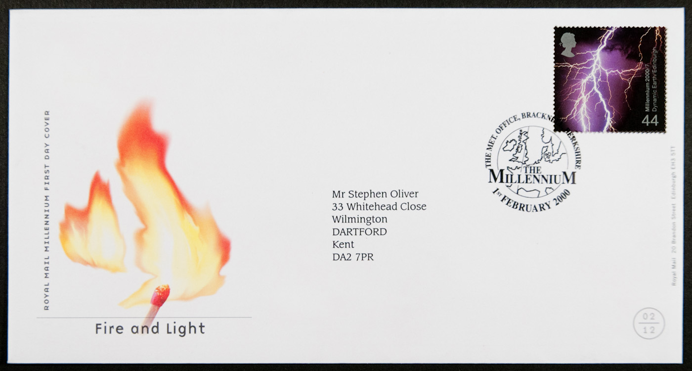 First Day Cover for Fire and Light which uses the stamp made, by the Royal Mail Society the UK's version of the post office, from my Titan Missile Silo Lightning Photograph February 1st 2000.