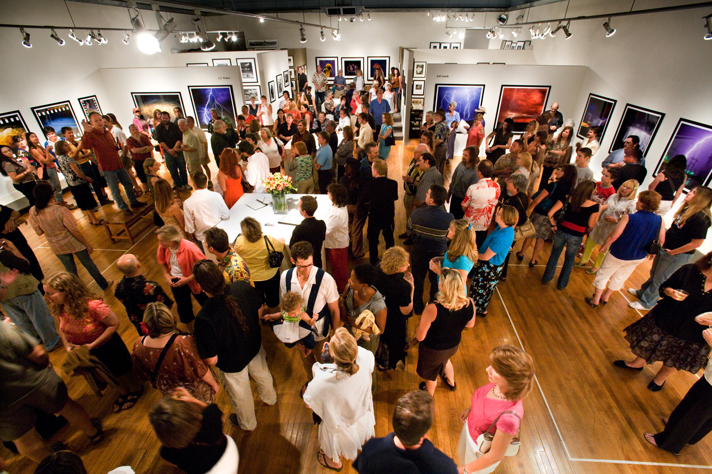 Out of a Blue Sky Opening at Etherton Gallery. Opening night at Etherton Gallery for Lightning Photographers Jeff Smith and A.T. Willett, wow, there was really a lot of people there for our show. This show featured our severe weather images from more than 20 years of shooting storms. Terry is standing up the on bench giving a talk. Jeff Smith shot this with a remote camera. Opening photo at Etherton Gallery for Out of a Blue Sky, 2007.