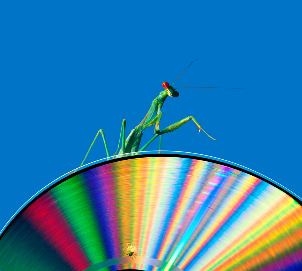 Data Mining Praying Mantis on a DVD showing lines of burned data, that Aphid showed up just in time for lunch. I was super close with a macro lens and the mantis would jump into my hair. I had to recreate the edge of the DVD and the black line in Photoshop as the normal edge does not look this smooth when you are this close.