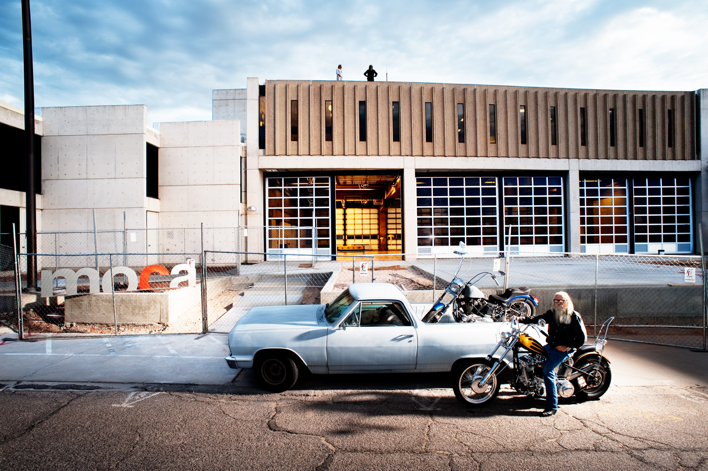 This was shot for MOCA back in August with the artist Olivier Mosset arriving at the MOCA DMZ when the entry way was under construction. This image was a composite of 8 images all different exposures shot from the exact camera position and then composited back into one image in Photoshop. It took about 6 hours to put it together once shot. You can even see one of Gwyneths Jellies hanging inside the space. You can see Olivier and Anne Marie on the roof playing their rolls as devil and angel artists. Olivier hates to have his photo taken as a matter of fact he did not know he was going to be in photos that day.